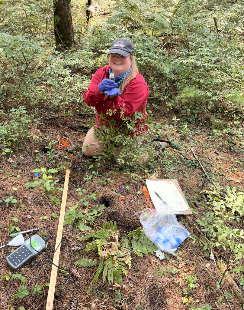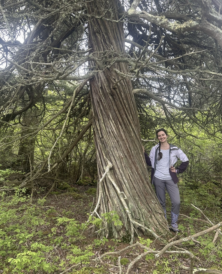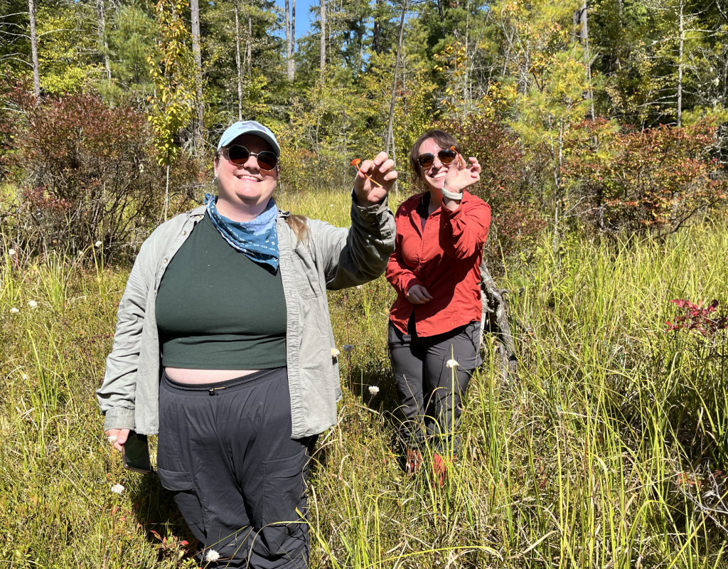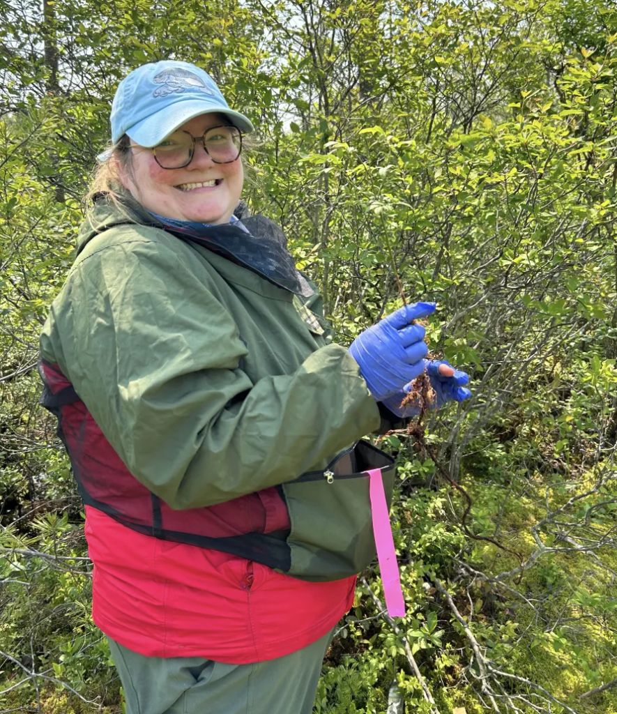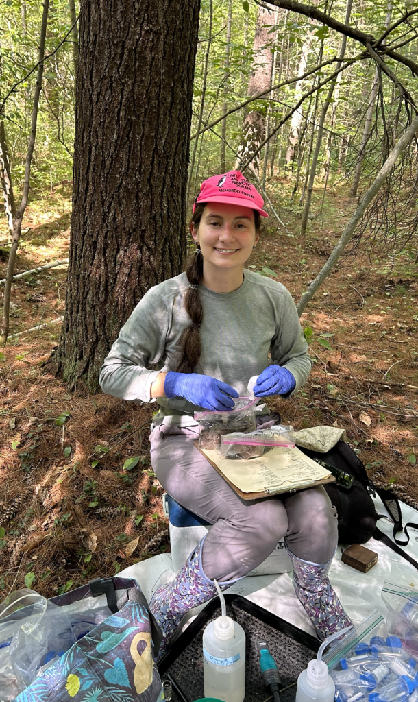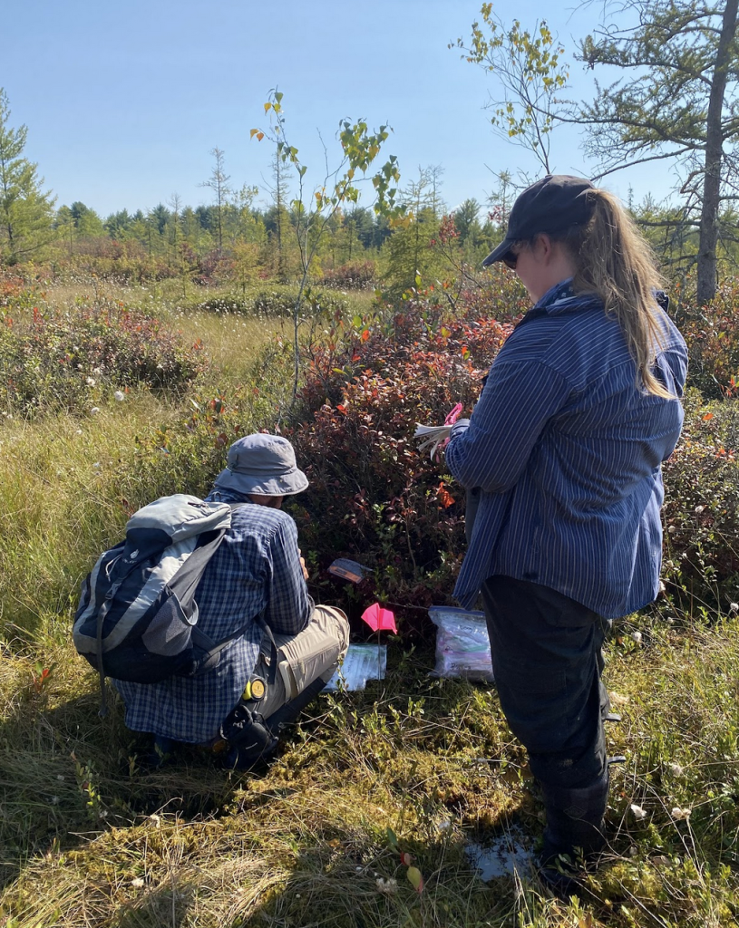 Miranda collecting ericoid seedling roots to sequence mycorrhizal partners.Olivia by an Atlantic White Cedar in one of her wetland study sitesTrying to find the water table!