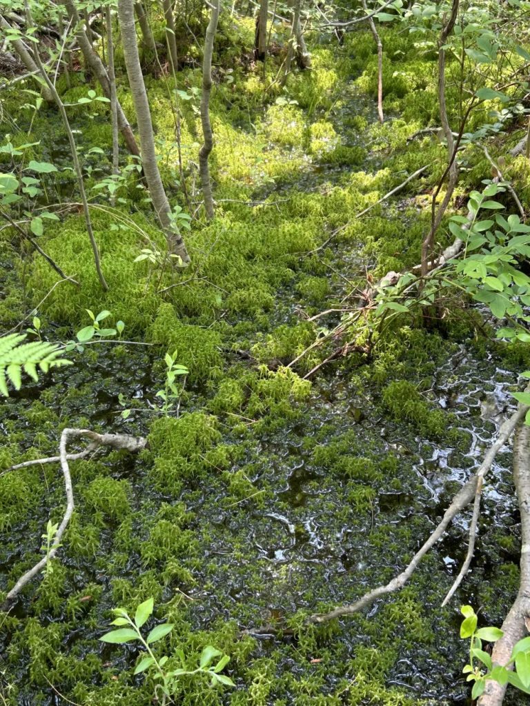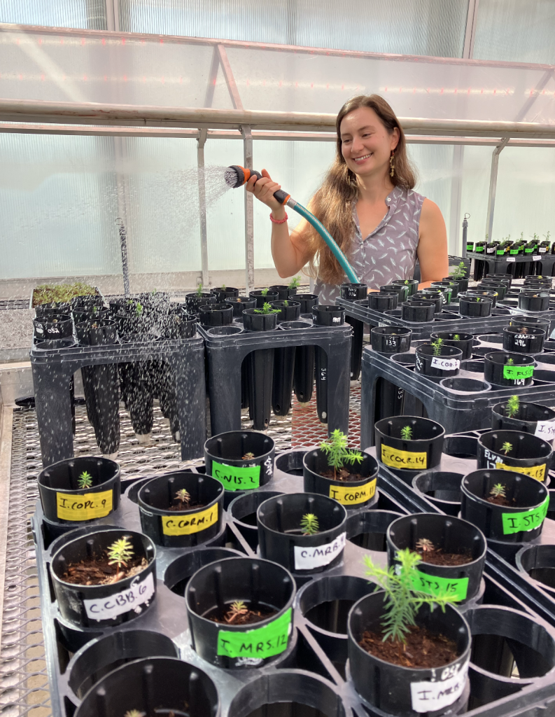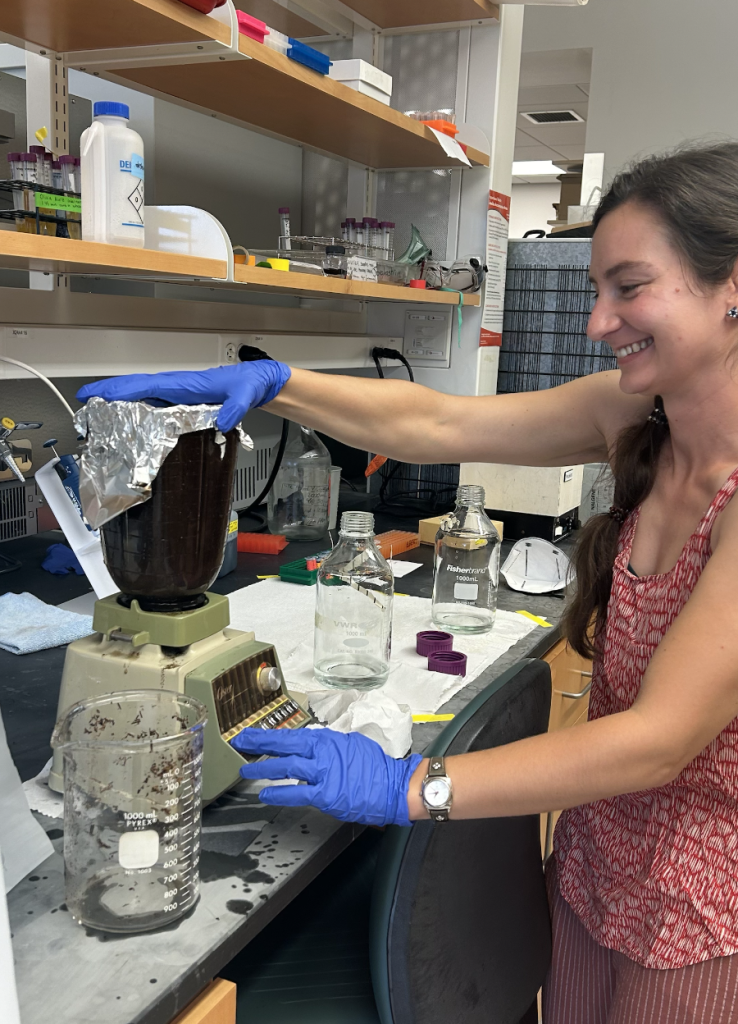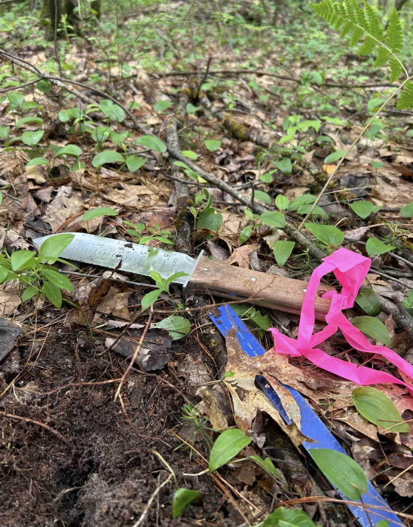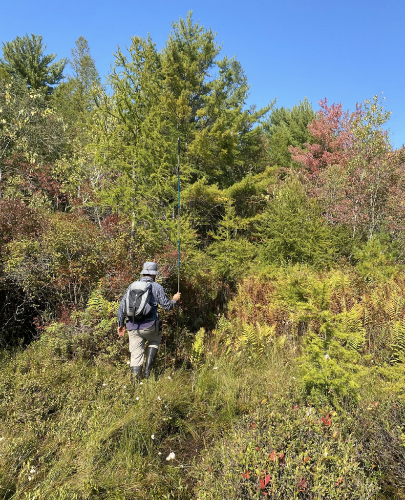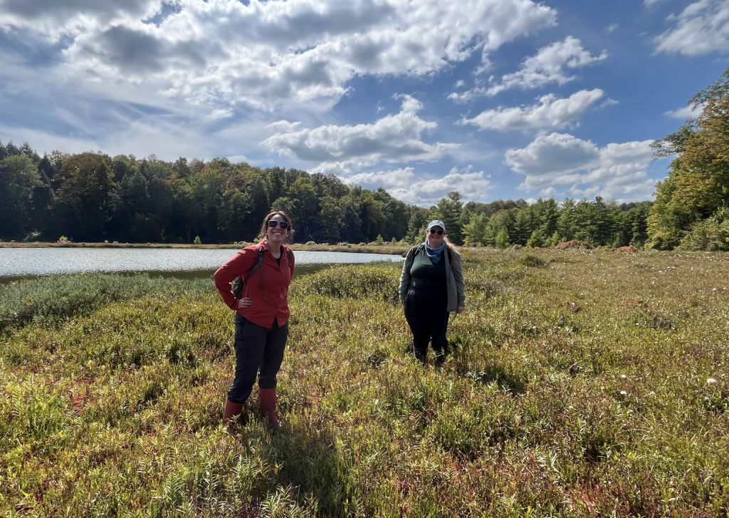 Miranda collecting ericoid seedling roots to sequence mycorrhizal partners.Olivia by an Atlantic White Cedar in one of her wetland study sitesTrying to find the water table!